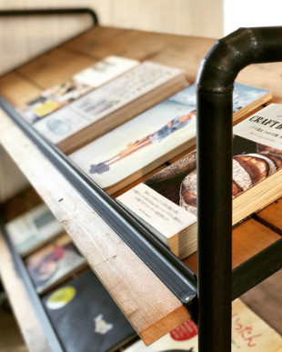 フレーム:クリアー塗装仕上げ 棚板:古材オイルフィニッシュ シンプルですが要所にアクセントを付けたデザインになっています。 キャスター付きのブックシェルフはレイアウトを変えるにも手軽に移動が出来て大変便利です。