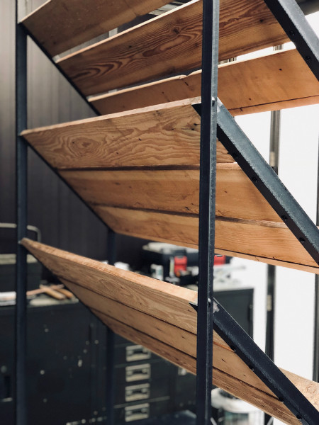 古材をカットした棚板が付きました♪ 上三段は45度の傾斜が付いていて、一番下のみフラットになっています。 マルチシェルフと言うだけあって趣味や用途によってマルチに使えます♪ ここから棚板をオイルフィニッシュで仕上げ、脚元にキャスターを付ければ完成です。 ☞furniture gallery ☞furniture new product ☞store